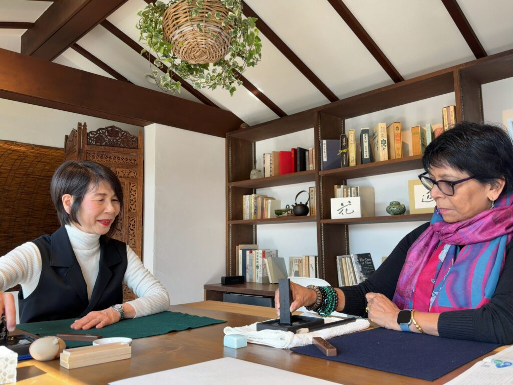 You’ll begin by meeting the traditional tools: ink (sumi:墨), ink stone (suzuri:硯), brush (fude:筆), and seals.